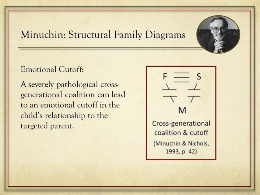 In 1994, Salvador Minuchin provided the Structural family diagram for a cross-generational coalition of the child with one parent against the other parent, resulting in the emotional cutoff. Notice the “inverted hierarchy” of the child with the father above the mother – note too that Madanes began her Chapter on Hierarchy with a section discussing the cross-generational coalition.