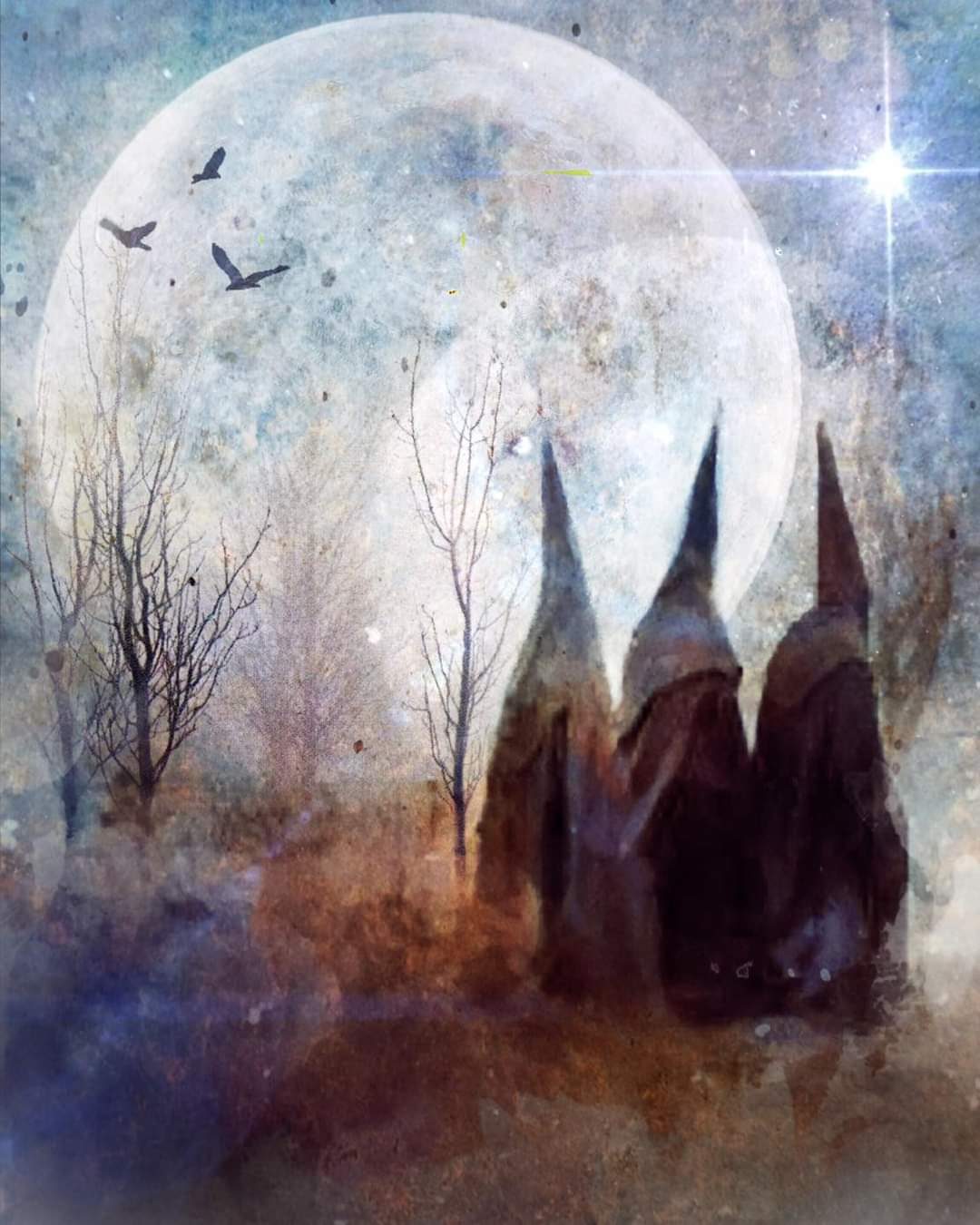 Artistically, the three birds allude to the trinity within us of Maiden, Mother and Crone, reflecting the three figures themselves. The bare trees represent as figuratively “not yet bearing fruit” because all of the world is waiting for His birth. And of course, the “Star” of Bethlehem which is the astrological conjunction the mages knew as the sign of this historical event. I chose the colors of autumn to winter allowing the timeframe to fit the period of just before the winter solstice, when light returns to the world anew.