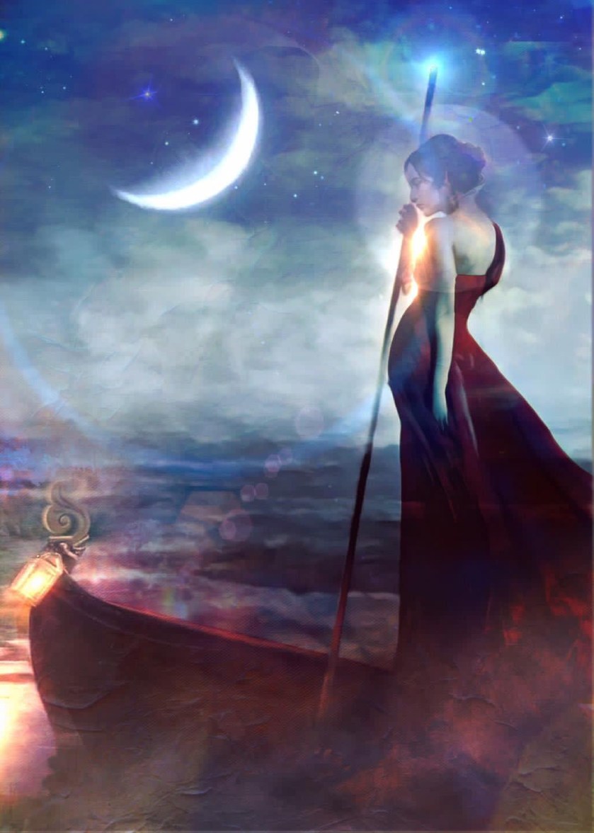 On the stern hangs the lamp of wisdom, filled with oil, to light her way. In the sky, the waning moon represents She Who Is, the Divine Feminine, promising assurance that the pilgrim is never alone, and provides continued light along the journey which will illumine to full, shining down and guiding the pilgrim through even the darkest waters. The pilgrim stands strong and self-assured, dressed in a red mantle which indicates her earthly path and sacrifice but also her royal place and power. The waters are choppy, to remind that the voyage may not be smooth, but the cloudless sky with its shining stars indicate her true destination and the clarity which she possesses to navigate her return to the heavenly realms. She holds the staff, or the uas, which represents her power and is thematic and controls the flow of cosmic energy. So the painting also points to our eternal destiny.