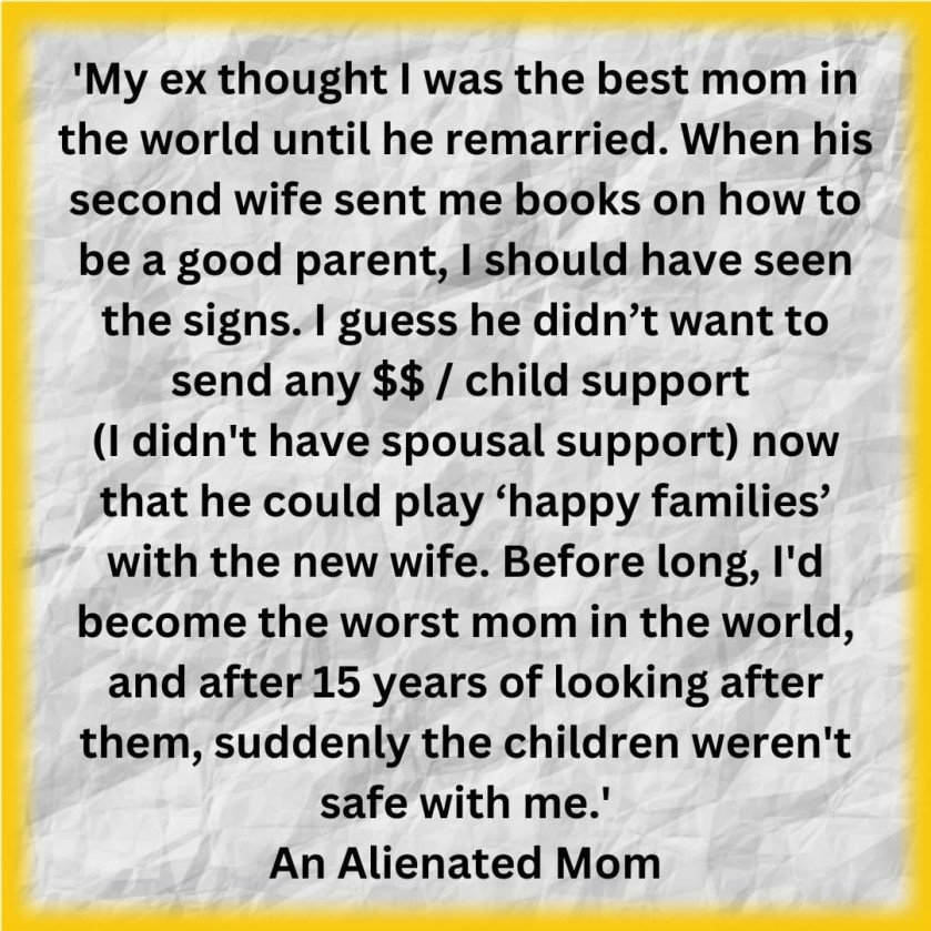 Money often motivates alienating behaviours. If there’s a personality disorder too, it’s a double whammy. Alienators are controlling, and money is a system of control too. Mind control is subtle, and it coercively nudges and persuades and influences, it changes thoughts and beliefs, but it’s entirely invisible. All anyone might see is the pretence of protection, best intentions, and care while, in truth it’s all about profit and power. Entirely selfish behaviours. This is how governments work too, and a debt-based financial system which is in itself disordered and broken. So, money and alienation often go hand in hand, a nightmare partnership, controlling and manipulating. The child might feel they are acting autonomously. They may believe the ‘grass is greener’ with the alienating parent. They may have been induced with bribes by a ‘Disneyland Parent’. Deep down, the child will know they are being played, but children, especially at a certain stage, are more selfish, and pliable, and try to spread their wings more anyway. But if there were years of a good, loving relationship with you and your alienated child/ren, despite all the rubbish the alienating parent says and does, the love will still exist between you and your child/ren. It may take time, but the relationship can be repaired