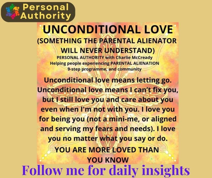 In many ways, the alienated child, however long they cut off emotionally, and for however long, knows they have our love. It’s a given. But they’re not secure in the love of the alienating parent, and they’ve been told they’re the ‘all and everything’ and filled with negative thoughts and beliefs about the ‘target’ parent. It’s confusing, upsetting, and psychologically abusive. They start to doubt their feelings and beliefs. They trauma bond with the alienating parent for fear of losing both parents. For fear the alienating parent might be right. And yet, deep down, when they allow themselves – and are brave enough to face it, overcoming the feeling of guilt, and the fear/control of the alienating parent – they know you love them. Sometimes they don’t know it on a conscious level, or they ‘cut off’ and psychologically ‘split’ in order to comply with the alienating parent and feel safe somewhere, but on an unconscious level, where there was once love, there is still LOVE. Let’s hope they can be open to it, take off the bandaid of control/fear, and feel it. They are truly more loved than they (allow themselves) to know. Never give up hope. Near or far, think of them with love.
