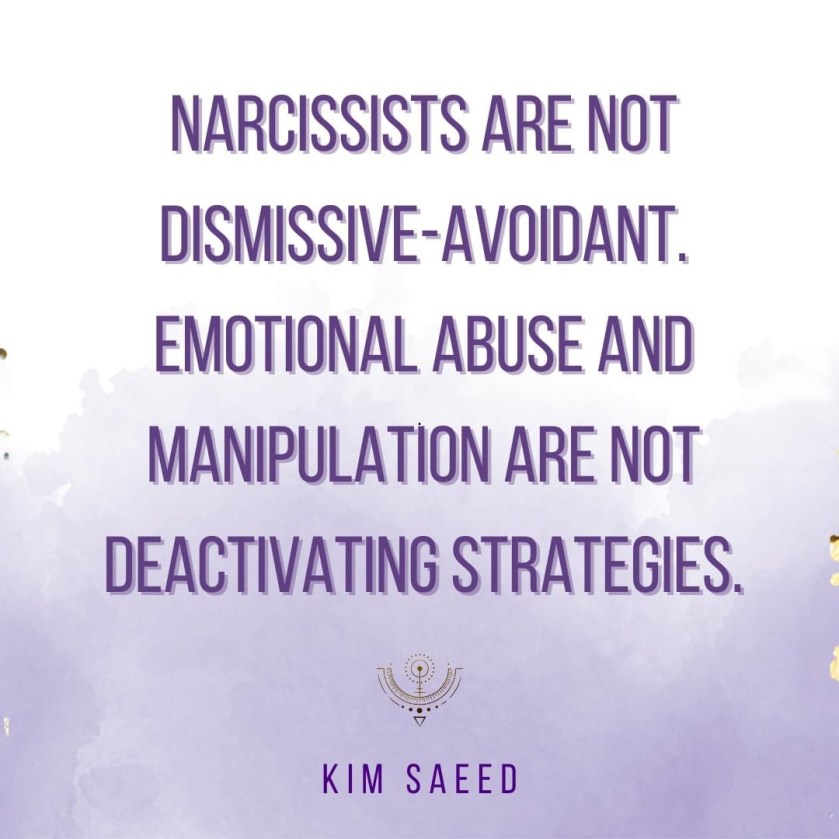 One example of this is believing that a narcissistic person is simply dismissive-avoidant. But, emotional abuse and manipulation are not behaviors of someone who is “dismissive-avoidant”.