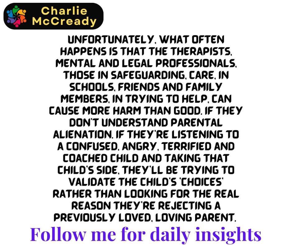 Well-intentioned professionals, therapists, legal experts, friends and family members, can inadvertently worsen the situation. This occurs when they do not understand parental alienation. They often, not without reason, prioritise the child’s perspective, not taking enough into account the covert, coercive, harmful influence of an alienating parent, almost indoctrinating this child. The child may seem highly passionate and plausible. They may express confusion, anger, fear, but not so much of the manipulation. By validating the child’s apparent “choices,” people who could otherwise be more supportive of all the victims of alienation (not just the child) often overlook the deeper causes behind the rejection of a previously cherished and caring parent.