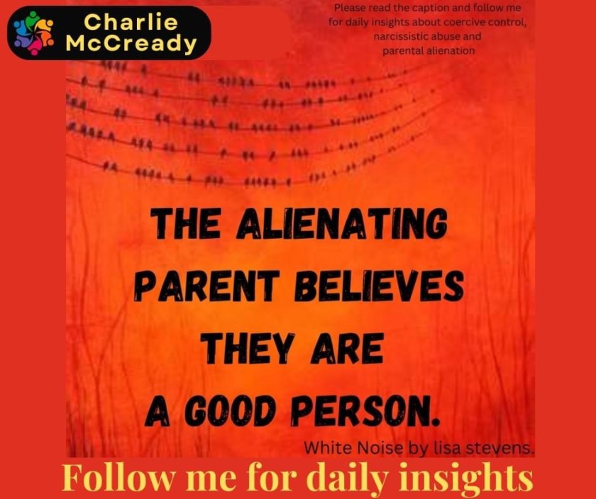 Abusive people who lie, cheat manipulate, and hurt others with impunity, and no accountability or guilt, sometimes actually think of themselves as victims. No matter how badly they treat people, it’s not their fault. It’s your fault. In fact, the problem probably started when you started noticing their abuse. And to add to this problem, the fact they get away with their abuse, without facing punishment or consequences, the fact they can carry on, in their minds, justifies their behaviour. The alienating parent often genuinely believes they are right and good. Wow!