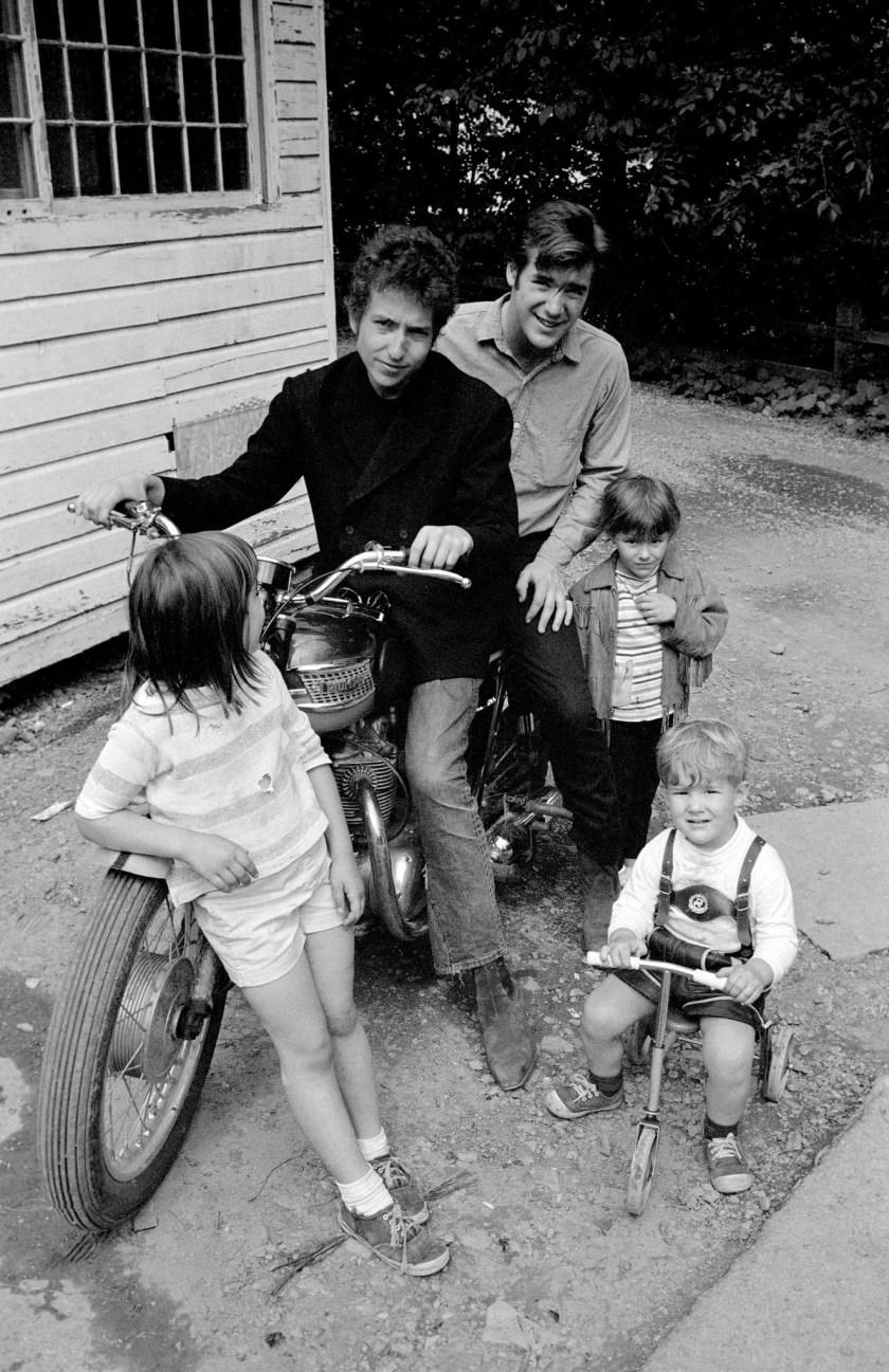Photo of Bob Dylan and John Sebastian on Dylans’ Triumph with the Paturel children in the alley behind the Cafe Espresso, Woodstock, NY, by Douglas R. Gilbert (1964)