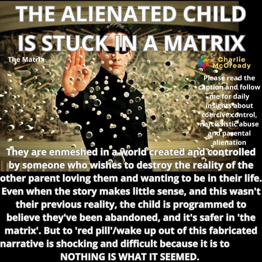 An alienated child has been coached to see one parent (the favoured/alienating one), as good and the other (the target parent) as bad. They align with the good and reject the bad. The child cannot bear to hear the words ‘parental alienation’ and will angrily and defensively reject this idea. I know this from personal experience. It’s a mistake. It doesn’t help us to tell them of their alienation. It just adds fuel to the fire. But how can it possibly make things better for ‘the bad parent’ to say ‘bad things’ about their influencing ‘good parent’? All the defences will go up. They’ve been in the trenches. It feels real. They’ve been put in a warzone. They bear the wounds. It’s too much for them to think their ‘reality’ needs reviewing and unpicking. They were doing their best to survive. Trying to tell a child in this unbearable situation that they were put there by their apparently loving, aligned, ‘good’ parent, makes them feel attacked. This doesn’t help or heal anybody. It doesn’t heal your relationship, which is what you want. It is a ‘handle with care’ situation because of the abuse they (and you) have suffered at the hands of the parental alienator. What we need to do is remove the reason for their defensive behaviour. Don’t give them ‘ammo’ and try to avoid talking about ‘parental alienation’ or anything associated with it. Be there with your white flag. Peaceful. Loving. Non-reactive. Be the healthy, sane parent. If they continue rejecting you based on the unreal fiction in their mind, and when you’ve done nothing other than being the target parent (suffering spousal psychological abuse to their child psychological abuse), we wait for them to wake up to the truth. It is far easier to stay in the dark ‘unreality’ of the alienating narratives they heard for so long. But when they truly become independent-minded, if they can step out of the ‘matrix’, they can start to heal and see you in the right, true light.