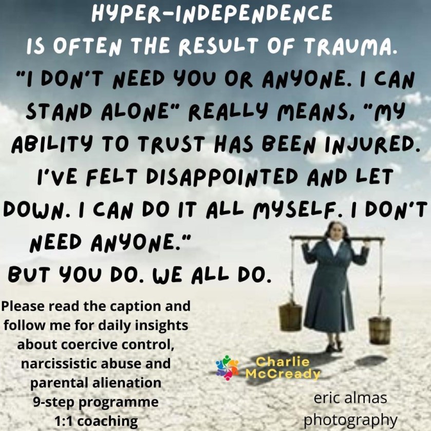 Our alienated child needs others too. They need both loving/loved parents in their life. If a person has suffered emotional damage from abandonment, betrayal or broken trust, hyper-independence might be evidenced. The highly capable, independent and tough-skinned approach. The defensiveness. The need to not appear weak, vulnerable or in need of help. For the alienated child, they feel they can’t depend on either parent. One has behaved as a child, selfishly and belligerently (not to mention abusively), and the ‘target’ parent has been rejected as a result. To appease the alienating/aligned parent, the child has denied themselves a closer relationship (or any kind of relationship) with the parent who would give them unconditional love, emotional support and protection. The alienated child has parented the alienating parent and can be prone (sometimes by a trigger that takes them back to the root of the trauma) to feeling now that nobody cares about them. It is about trust. Who can they trust if the person they trusted the most failed them so badly? The child/hyper-independent person must learn to trust the rejected parent, putting aside all their sense of guilt and shame and confusion. It is hard for them to learn to be vulnerable and trusting. But it can be done, and it is an incredibly powerful and healing step forwards when they do this. When we all do this.