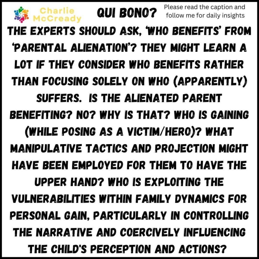 Understanding these benefits – qui bono – is vital for professionals, family members, and courts involved in such cases. Awareness of the manipulative tactics employed by alienating parents is crucial. This awareness can empower people to devise strategies that safeguard the child’s well-being and promote a healthy relationship with the targeted parent. By fostering an environment where the child can thrive emotionally and psychologically, interventions can mitigate the damaging effects of parental alienation.