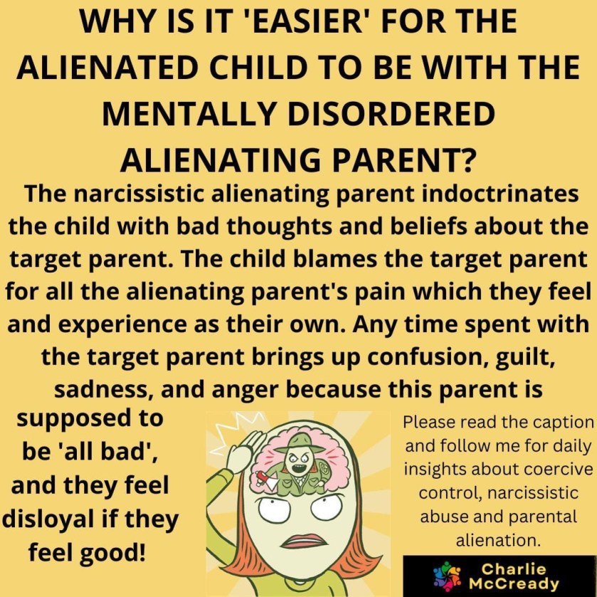 Imagine the child feeling guilty about enjoying their time spent with a loving/loved parent! This internal conflict arises after being exposed to an alienating parent’s relentless barrage of negativity about the other parent. The alienating parent, driven by narcissistic tendencies, manipulates the child into believing that the target parent is the source of all their pain and should be viewed as wholly ‘bad.’ They make it quite clear (verbally and also non-verbally) that if the child has any positive words or feelings about the ‘bad’ parent this is definitely not good. How confusing this is to a child! It’s psychological manipulation by a trusted parent, emotional abuse inflicted on a child. The alienating parent mirrors cultish indoctrination, damaging the attachment bonds the child will naturally have with their alienated parent (with both parents). This is why they succumb to the alienation. Not because they don’t love the other parent. Although hearing bad things about them contributes greatly, most of all their resistance is relentlessly worn down. It’s exhausting. It’s a survival mechanism to ‘cut off’ emotionally which is perhaps the only way they can do what is required of them by the ‘aligned’ parent. In this way, and only this way, their life is ‘easier’ and this is why the alienated child might often say or think the ‘target’ parent should do the same and just bow down and submit. To quote some alienated children, the target parent should just ‘suck it up’ or ‘apologise for everything’. It is not easy for them to live with a mentally disordered parent who is basically a bully – not every day, not always – the hot/cold moods are unpredictable. But the alienating parent is generally a highly volatile, cluster b personality (histrionic, borderline, narcissistic) and they put themselves above all others, including their own children.