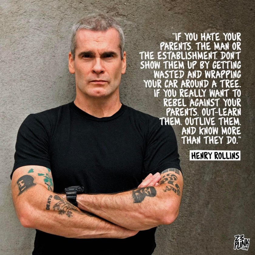 “If you hate your parents, the man or the establishment, don’t show them up by getting wasted and wrapping your car around a tree. If you really want to rebel against your parents, out-learn them, outlive them, and know more than they do.” – Henry Rollins