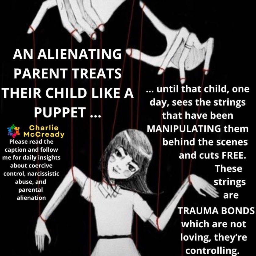 Possessiveness is not love. But when we are attached to an object, a goal, a dream, or another person, even our children, there are feelings that tell you: “If I don’t have that, exactly as I wanted it to be, I won’t be happy, I won’t be whole.” Attachment is connected to the ego. The ego is a construct of yourself that you’ve built through years of conditioning. Control is not love. Control comes from fear. Alienated children fear losing the love of the resident parent. They’ve been turned against the alienated parent, so that would leave them parentless. They cling for survival, out of fear, to the alienating parent. Fear is not love. When a parent is narcissistic, they will prioritise themselves above their child. Alienating behaviour is not loving, it’s about control, which is about fear.