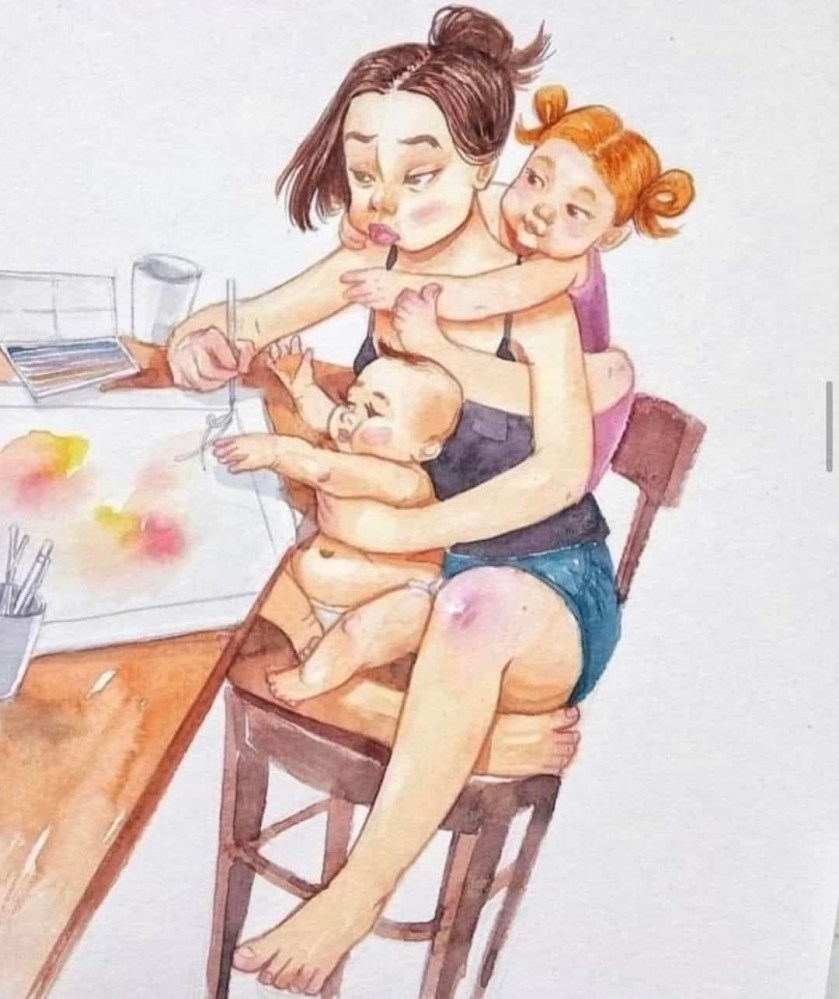 M: She goes to the supermarket to buy groceries or she does shopping for the house. Sometimes she forgets something and has to do the whole trip again with the crying baby. Once she returns home, she has to feed and breastfeed the baby, change his diaper and prepare him for a nap, clean the house and do the laundry. You know, since she doesn’t work.
