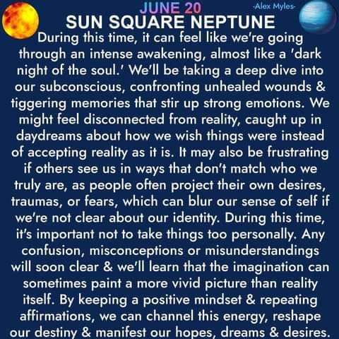 Sun square Neptune can make us feel like we’re existing in an entirely different reality, as this potent aspect heightens energy levels for at least 72 hours, enhancing sensitivity and imagination.