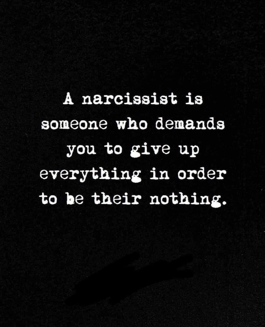 A narcissist is someone who demands you to give up everything – your dreams, your desires, your goals, your friends, your family, your identity – in order to be their nothing. They require you to sacrifice your very essence, your autonomy, and your individuality to feed their insatiable ego and satisfy their need for control.