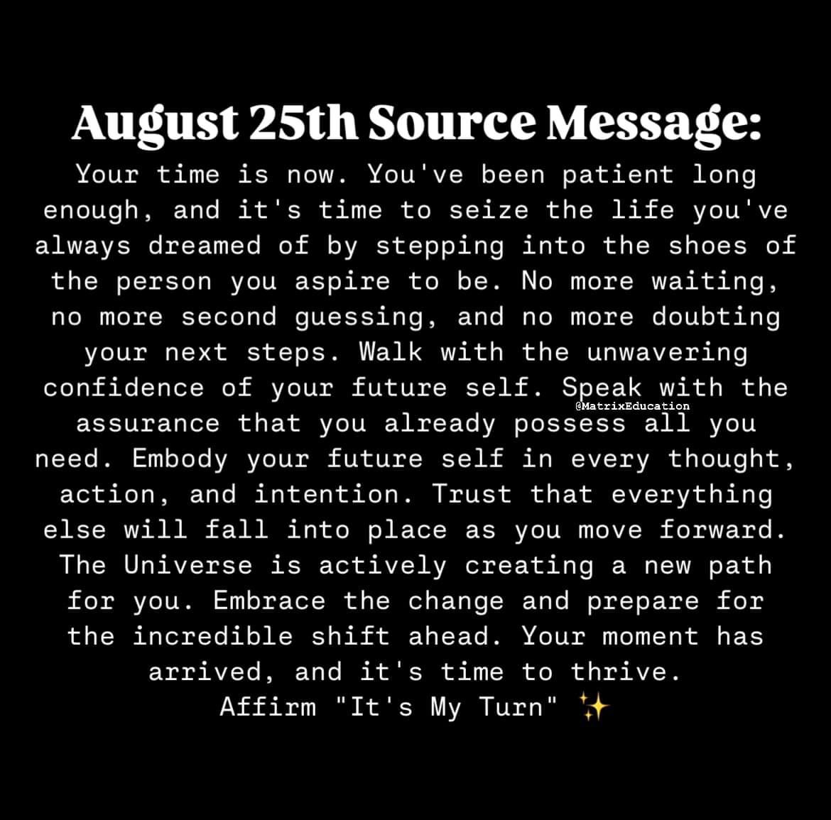 Affirm “It’s My Turn” and feel the power of these words energize your spirit. This is your moment to thrive, to embrace the changes and opportunities that lie ahead. The incredible shift you’ve been waiting for is here. Step into your power, live your truth, and watch as the Universe unfolds a magnificent path before you ✨🙏❤️🔥