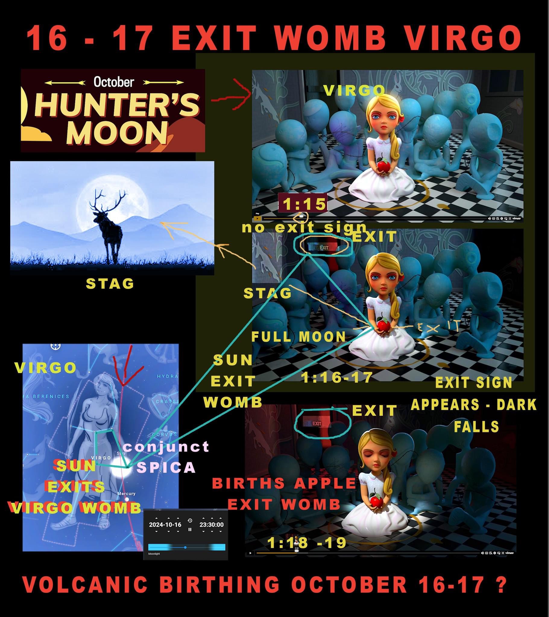 By the 17th to 18th you see the EXIT sign behind her glowing red – suggestive of a bloody birthing, but also of the volcanic Nature of the Virgin Earth birthing – for Virgo represents our physical House – our Bodies, our Earth on which we live – these are the true Church, Temple or House of God – He is the Fire within body and earth, the Kundalini Fire Serpent that is now – maybe – about to Return. … And we will all be changed … the dead will rise … its all yin and yang – the Rising Fire within the Earth is the Sign of a Return to Good after a dark period …