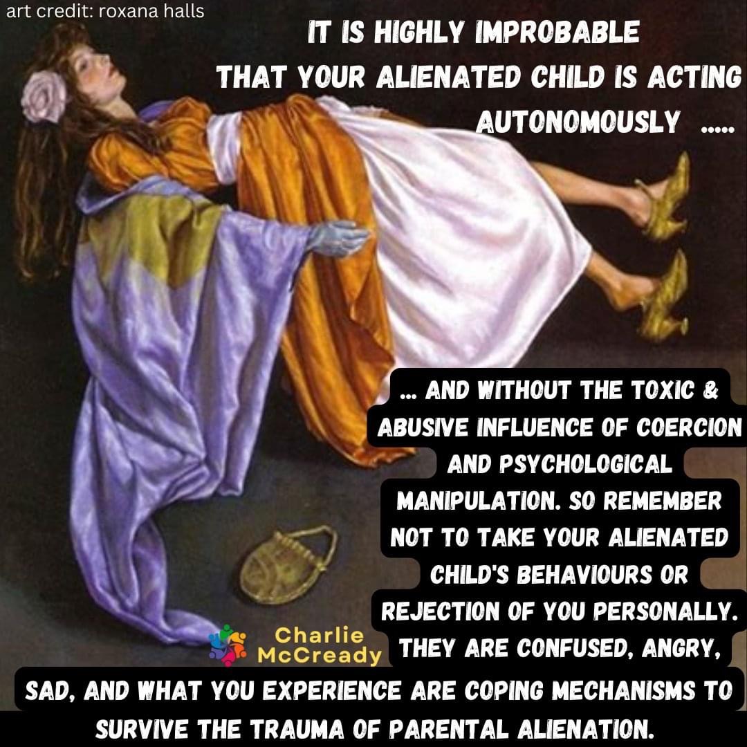 Dealing with the rudeness, insults, and rejection from an alienated child can be incredibly challenging and emotionally distressing for a parent. Hard as it is sometimes (and believe me, I know!) we must try to remember their behaviour and their words don’t stem from them. This was downloaded like a software programme, it was inflicted on them. It was repeated until they believed this programme was their own creation. The child acts out of trauma-bonded loyalty and enforced alignment. That can be really irritating and upsetting to witness, but they’re not aware of it. We are the ‘target’ and often it’s only us who sees it. That’s also difficult for us to cope with! So, unpacking all this, we have to remember that deep down, hidden and dormant maybe, our children love us. They’ve just been told they shouldn’t or can’t. Isn’t that appalling? It’s tragic for them as much as for us. They’re victims of this abuse too. They might be confused and in emotional turmoil. It’s hard growing up at the best of times. This adds a huge amount of pressure.