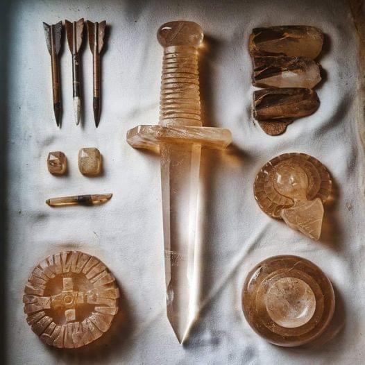 Beside the dagger lay arrowheads and blades, forming a crystalline arsenal as if prepared for the chieftain’s journey beyond life. Each artifact gleamed, symbolizing a final testament to the ancient people’s belief in the cycle of life, death, and the afterlife, with the crystal artifacts as their safeguard through unknown realms. To those who unearthed it millennia later, the dagger stood as a testament to an ancient people’s art, spirit, and enduring reach toward eternity.