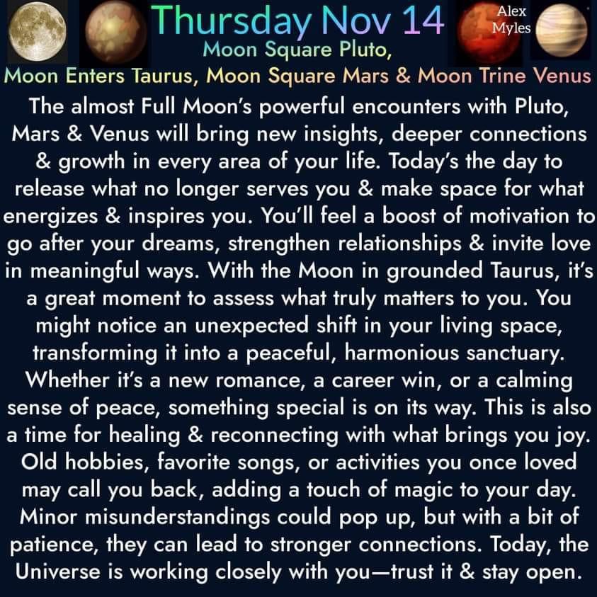 The Taurus Moon brings a steady, calming influence, perfect for finding balance and a sense of inner peace. Invite this calm into your relationships by setting intentions for connections that feel genuine, stable, and nourishing. With Moon trine Venus, there’s warmth in your interactions—release past concerns and allow room for deep, meaningful bonds to form. Let go of what drains you and welcome self-care and peace.