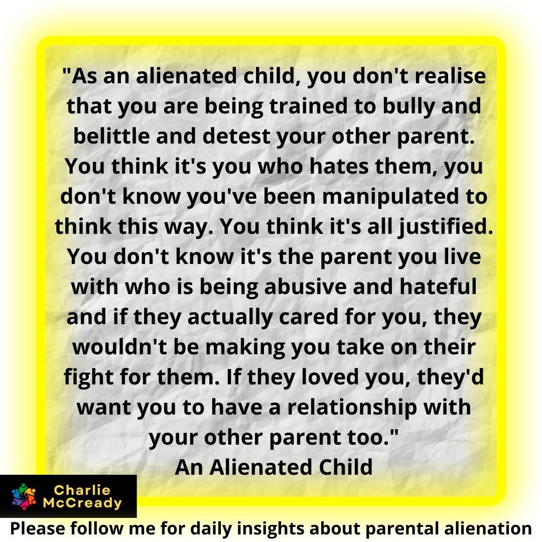It’s painful for the alienated child when they realise they’d put their trust in a parent who didn’t entirely have their best interests in mind, they were mostly thinking of themselves. They were being childish, vengeful and selfish when as a parent they’d have been expected, and trusted to be emotionally mature, mentally balanced, nurturing, and unconditionally loving.