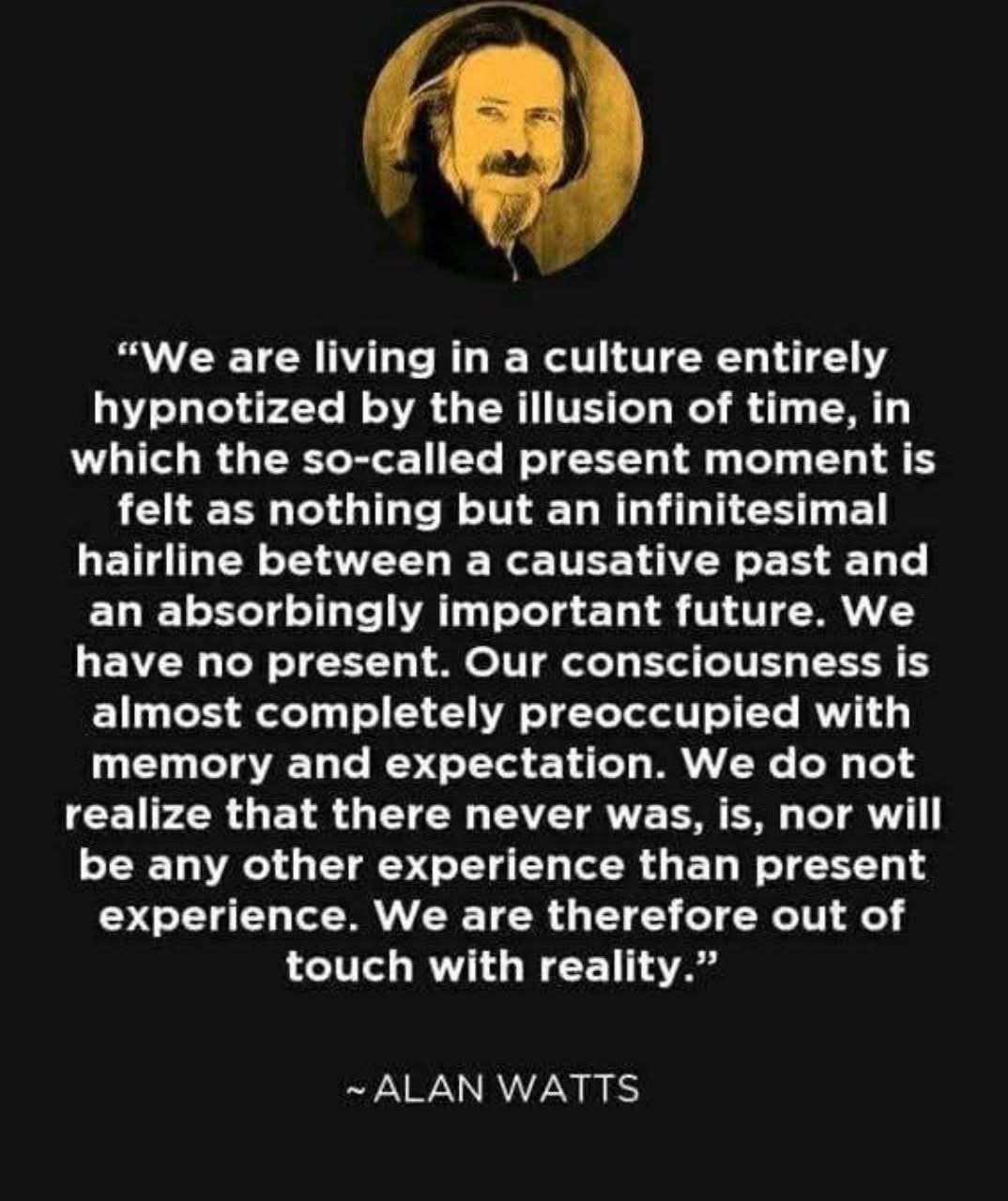Alan Watts captures a profound truth: our culture is obsessed with the constructs of past and future, often at the expense of the present moment. We chase memories, replay regrets, and fixate on plans, while the only real experience—the now—slips through our grasp.