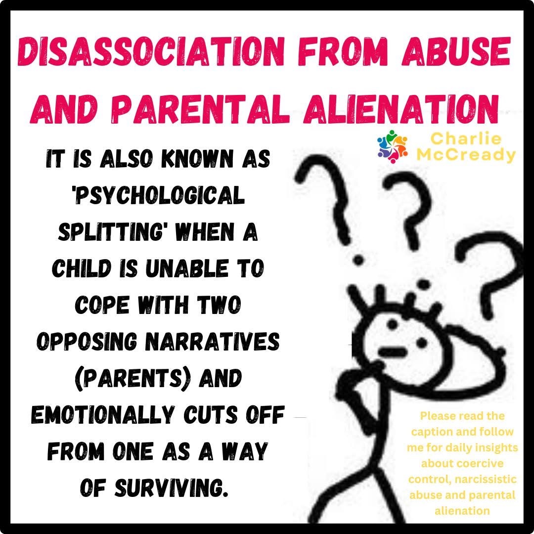 The emotional strain and confusion resulting from parental conflict can be overwhelming. The child may feel powerless, torn between loyalty to both parents or fearful of displeasing the ‘favoured’ alienating parent. Fear of displeasing the alienating parent, coupled with emotional manipulation and coercion, may prompt the child to distance themselves emotionally from the targeted parent, resorting to disassociation as a protective measure or psychologically ‘split’. This is because the child’s mind instinctively resorts to disassociation to protect itself from intense emotional distress.