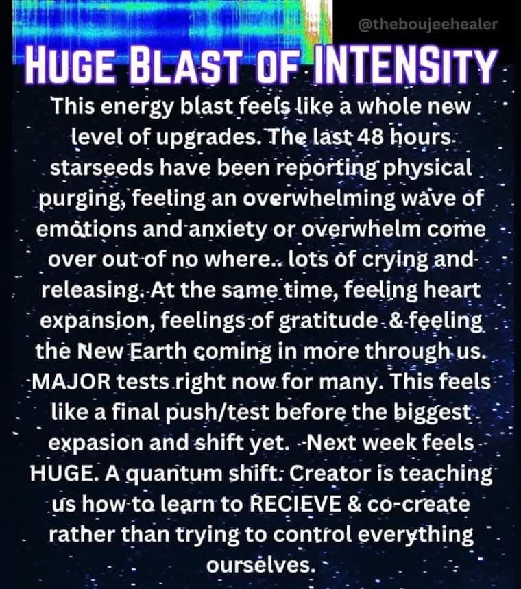 A significant energy wave impacted us a few hours ago, which may stimulate detoxification processes in the body. In some cases, this could lead to purging, which can manifest in various physiological responses. To support the body’s natural detoxification mechanisms, it is advisable to increase water intake throughout the day, as proper hydration facilitates the elimination of metabolic waste and supports overall cellular function. ~ Alexander Quinn – Starseed ❤️