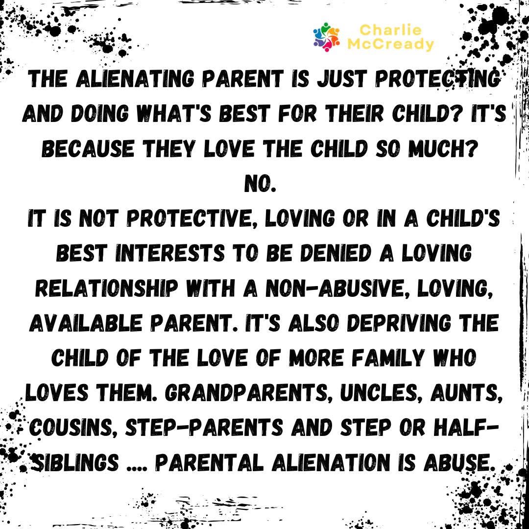 Denying a child a healthy and affectionate relationship with a non-abusive and caring parent is neither protective nor loving, and it certainly doesn’t serve the child’s best interests. This denial robs the child of the opportunity to experience love, support, and guidance from an emotionally available and nurturing parent. This abusive behaviour intentionally obstructs and robs the child of the love and support of an extended family network that genuinely cares for them. This includes grandparents, uncles, aunts, cousins, step-parents, and step or half-siblings. These family members often contribute to a child’s emotional growth, sense of belonging, and overall well-being.