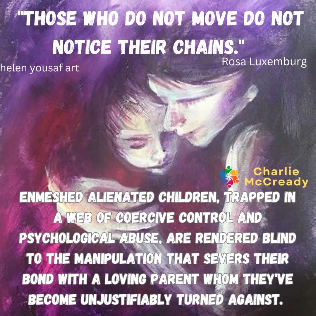 The quote about liberation from oppression captures how people can become so entangled in a situation that they fail to recognise their own subjugation. Alienated children are caught in a web of emotional manipulation, coercive control, psychological abuse, fear, and loyalty binds that prevent them from seeing the truth about the situation and, as a result, being distanced from a loving parent. The alienating parent creates a situation where the child’s perception becomes skewed, making it difficult for them to recognise the unhealthy dynamics at play and how they’ve become stuck, as if in chains. The children might believe they are acting out of their own free will, but they are held captive by invisible emotional chains, preventing them from breaking free and realising the depth of their situation. Often during custody battles, the control over the children and the indoctrination going on worsens. We need to keep raising awareness about parental alienation and its effects on children, as well as the need for intervention to help these children break free from the psychological control that binds them.