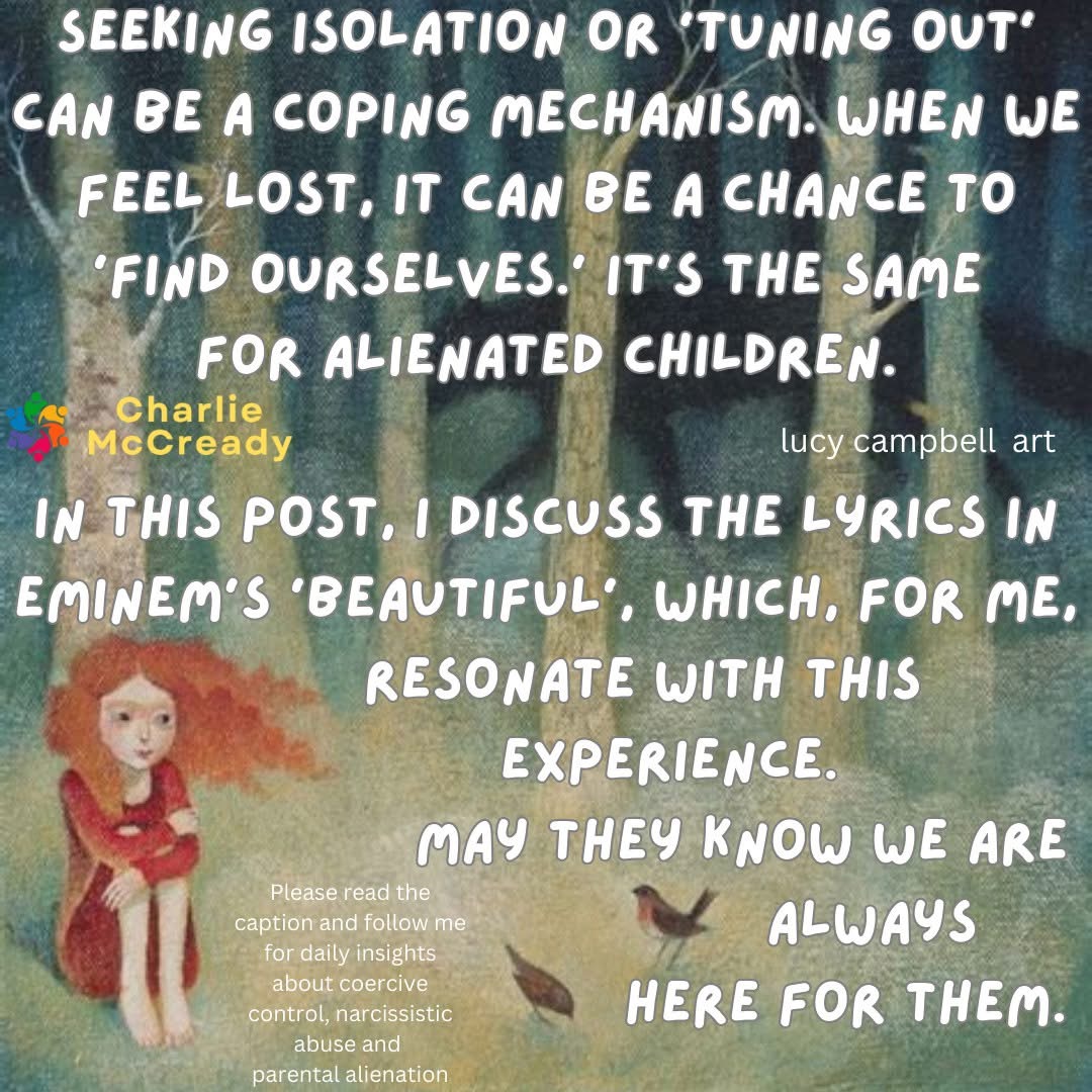 The song ‘Beautiful’, to me, is about alienation. It’s about longing for connection after being rejected, building ourselves up no matter how many times we’re set back or fall. We and our children are disconnected by enforcement and manipulation. We cope with it the best we can. The ‘distancing’ or ‘emotional cutoff’ is also known as disassociation. This is something in our children that the alienating parent can exacerbate, too.