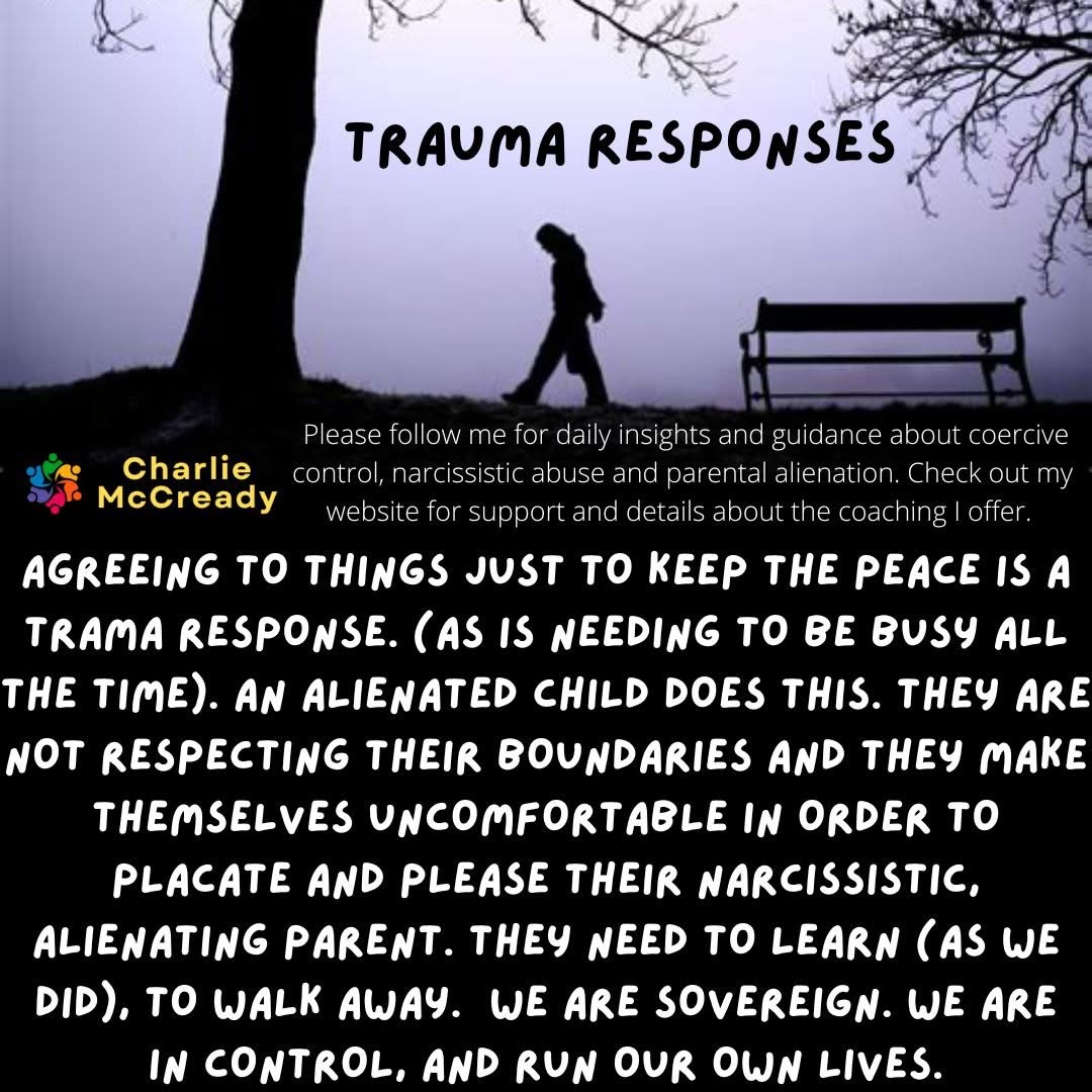 Agreeing to things just to keep the peace is a trauma response. It’s a way of surviving in a hostile or controlling environment where saying ‘no’ or ‘I don’t believe you’ isn’t an option without severe consequences. This response is often seen in alienated children—children who have been manipulated and coerced to the point that their own needs and feelings no longer matter. Instead, they learn to prioritise the emotions and expectations of the alienating parent. They walk on eggshells, eager to placate and please, because defiance causes even more trauma than they’re already dealing with.