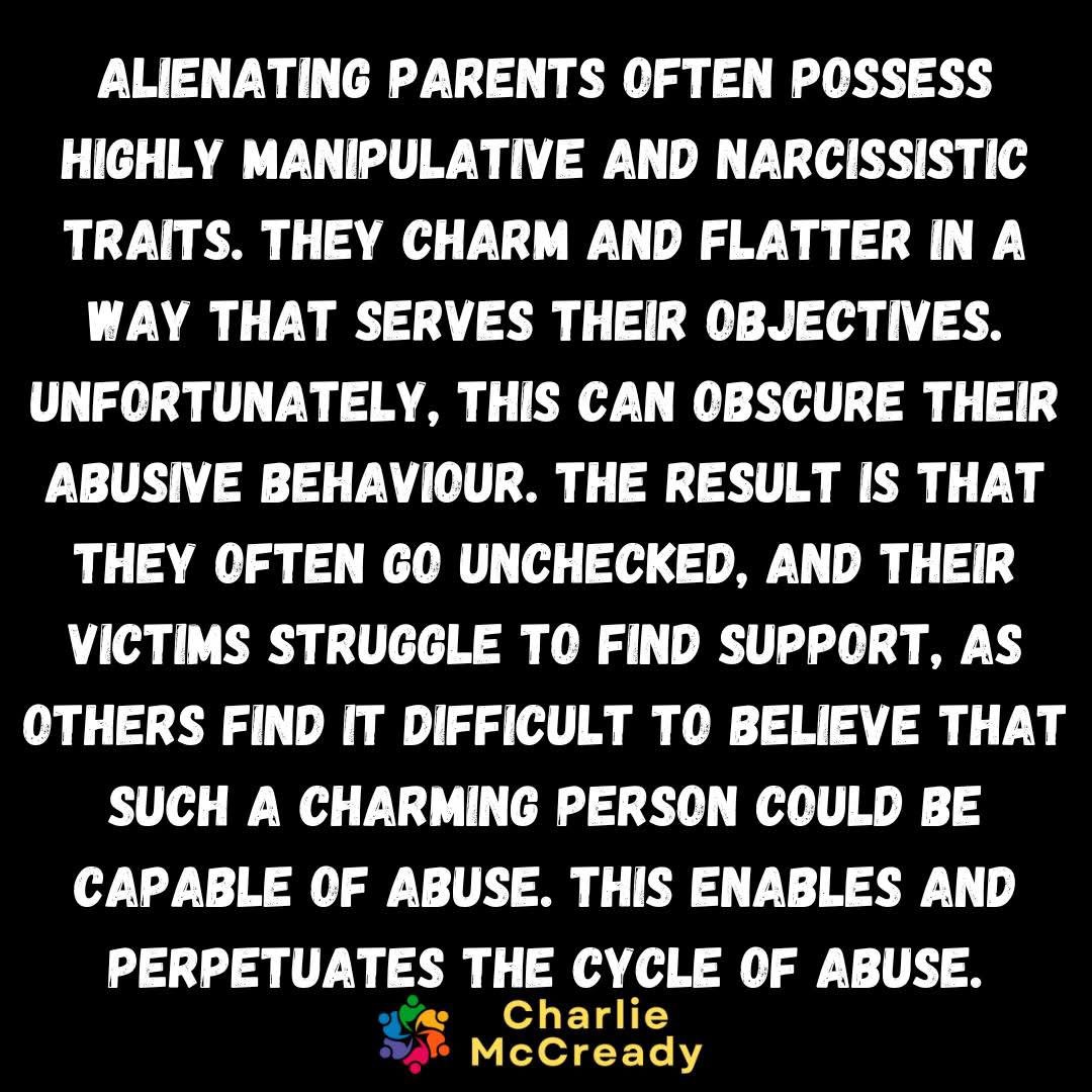 Alienating parents often possess highly manipulative and narcissistic traits. They charm and flatter in a way that serves their objectives. Unfortunately, this can obscure their abusive behaviour. The result is that they often go unchecked, and those they abuse (psychologically, financially, narcissistically) struggle to find support, as others find it difficult to believe that such a charming person could be capable of abuse. This enables and perpetuates the cycle of abuse.