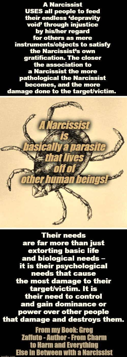 The habit of treating a human being or a person as a means to an end is utilitarian (to satisfy a need or fulfill an AGENDA) and fundamentally an inhumane or a pathological and perverted manipulation of our basic human rights. A Narcissist USES all people to feed their endless ‘depravity void’ through injustice by his/her regard for others as mere instruments/objects to satisfy the Narcissist’s own gratification. The closer the association to a Narcissist the more pathological the Narcissist becomes, and the more damage done to the target/victim. Their needs are far more than just extorting basic life and biological needs – it is their psychological needs that cause the most damage to their target/victim. It is their need to control and gain dominance or power over other people that damage and destroys them. They are BASICALLY human with most of the same biological needs (like eating, breathing and sexuality) but when it comes to mental functions, they are delusional and seem to have a battle that rages in their head to seriously harm people that love them as if they loathe all people and need to destroy them one by one.