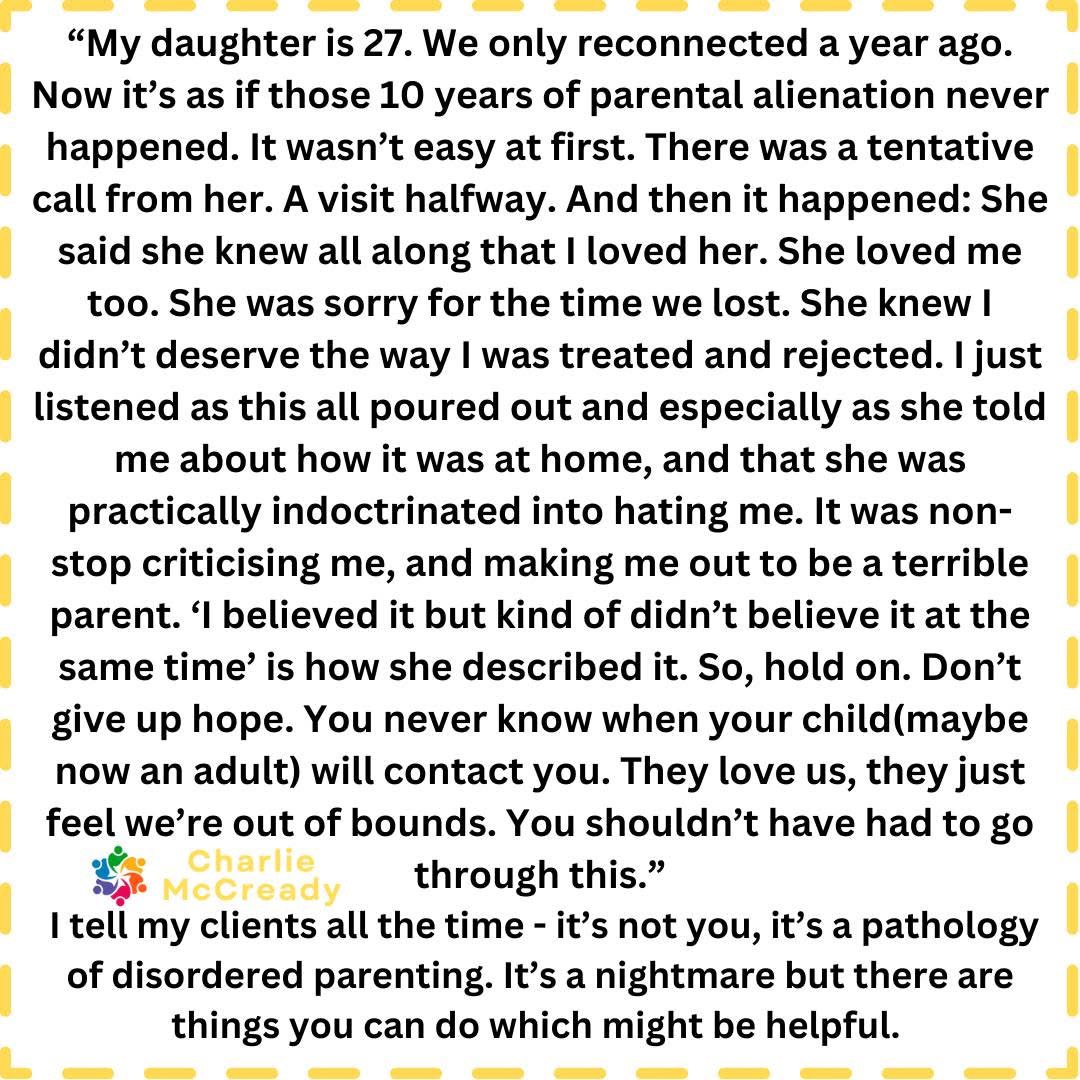 The story of this previously alienated mother shows that even after years of alienation, reconciliation is possible. Her child’s words—acknowledging the manipulation and indoctrination – must have confirmed her worst fears. Alienation is real! But the love was always there too! They’ve just been coerced and indoctrinated into feeling they do not, or should not love us. Let this remind you: love can persist, even through the darkest times.