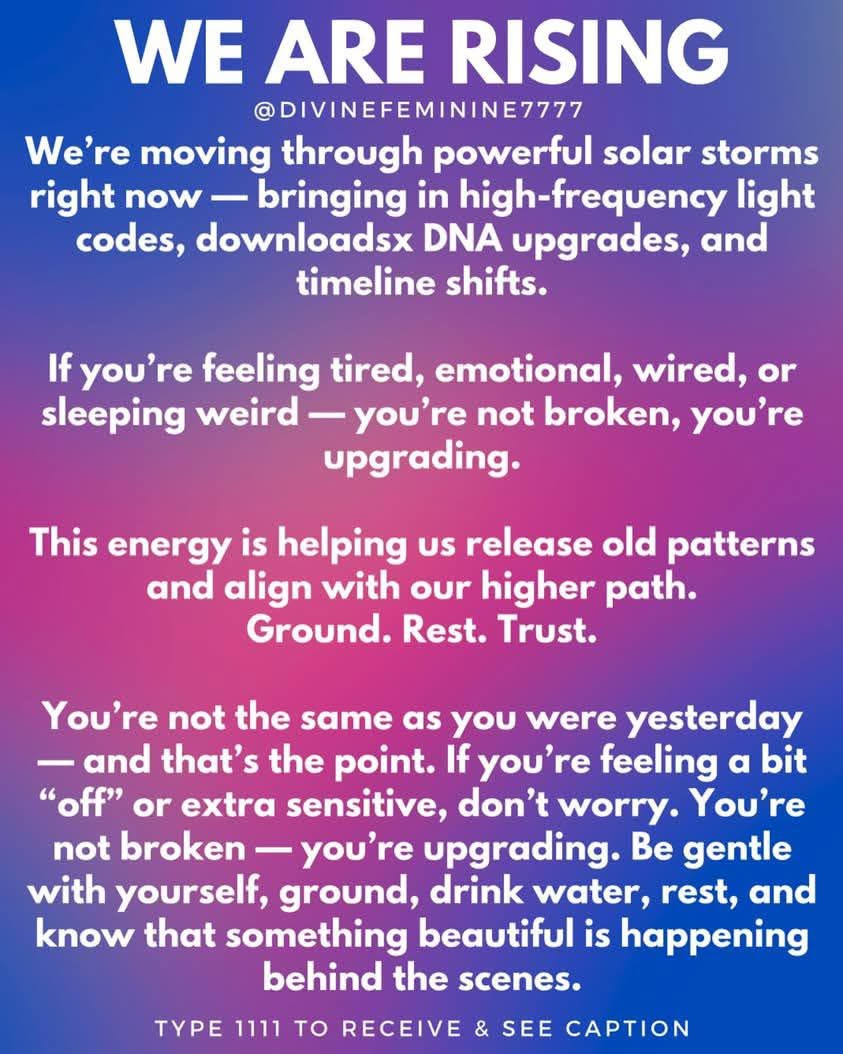 So if you’re feeling a bit “off” or extra sensitive, don’t worry. You’re not broken — you’re upgrading. Be gentle with yourself, ground your energy, drink water, rest, and know that something beautiful is happening behind the scenes. This is part of our ascension, and your body and soul are working together to help you level up.