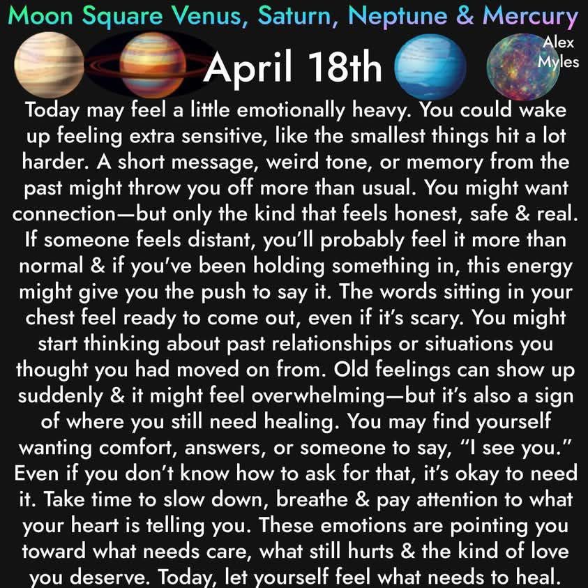 Later, Moon square Neptune softens things, and emotions flow in quietly, often without reason. You may get lost in a memory or feel waves of nostalgia without knowing why. These moments are reminders that your heart holds so much. Music, journaling, or simply sitting in silence may help you move through what words can’t express.
