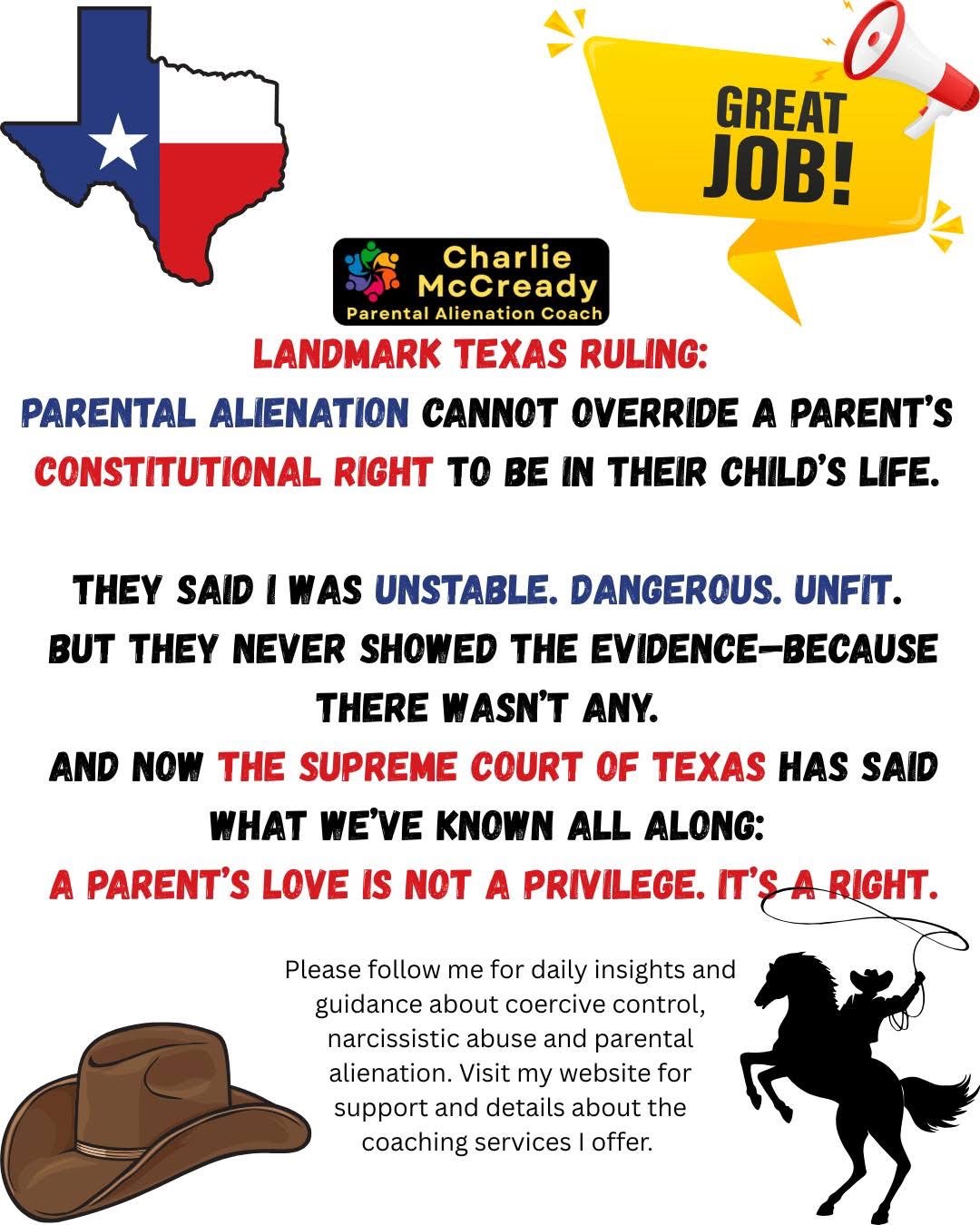 If you’re a targeted parent in Texas, or anywhere, let this be a reminder: alienation thrives in silence and delay. You are not overreacting. You are not imagining it. If your child suddenly uses language that sounds rehearsed, if they repeat adult arguments they couldn’t possibly understand, if you’re constantly shut out of decisions, denied visits, or blamed for everything—that is not a child acting freely. That is a child caught in the grip of cognitive dissonance, ‘brainwashing’ … coercive control. It is child psychological abuse and spousal/partner psychological abuse.