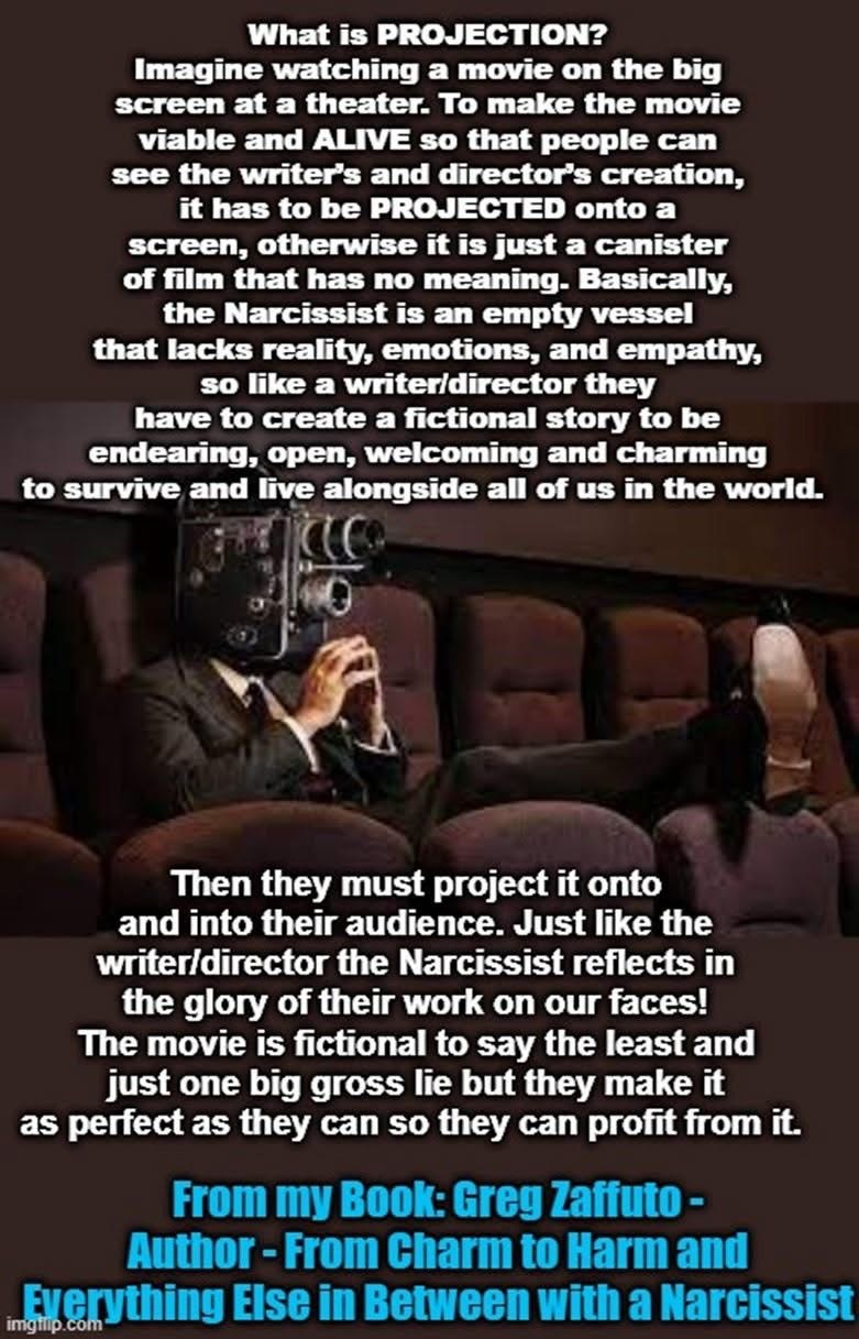 More about PROJECTION? Imagine watching a movie on the big screen at a theater. To make the movie viable and ALIVE so that people can see the writer’s and director’s creation, it has to be PROJECTED onto a screen, otherwise it is just a canister of film that has no meaning. Basically, the Narcissist is an empty vessel that lacks reality, emotions, and empathy, so like a writer/director they have to create a fictional story to be endearing, open, welcoming and charming to survive and live alongside all of us in the world. Then they must project it onto and into their audience. Just like the writer/director the Narcissist reflects in the glory of their work on our faces! The movie is fictional to say the least and just one big gross lie but they make it as perfect as they can so they can profit from it.