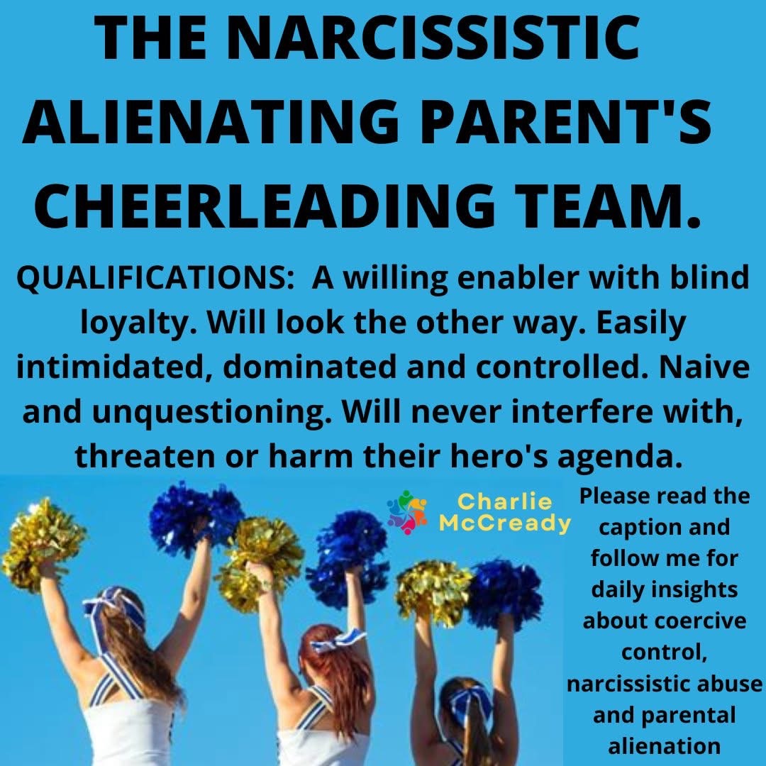 The alienating parent often seeks to create a support system comprised of people who enable, support and reinforce their behaviour. These enablers are like a cheerleading team, and they play a significant role in perpetuating the alienation. Here’s how this dynamic typically works: