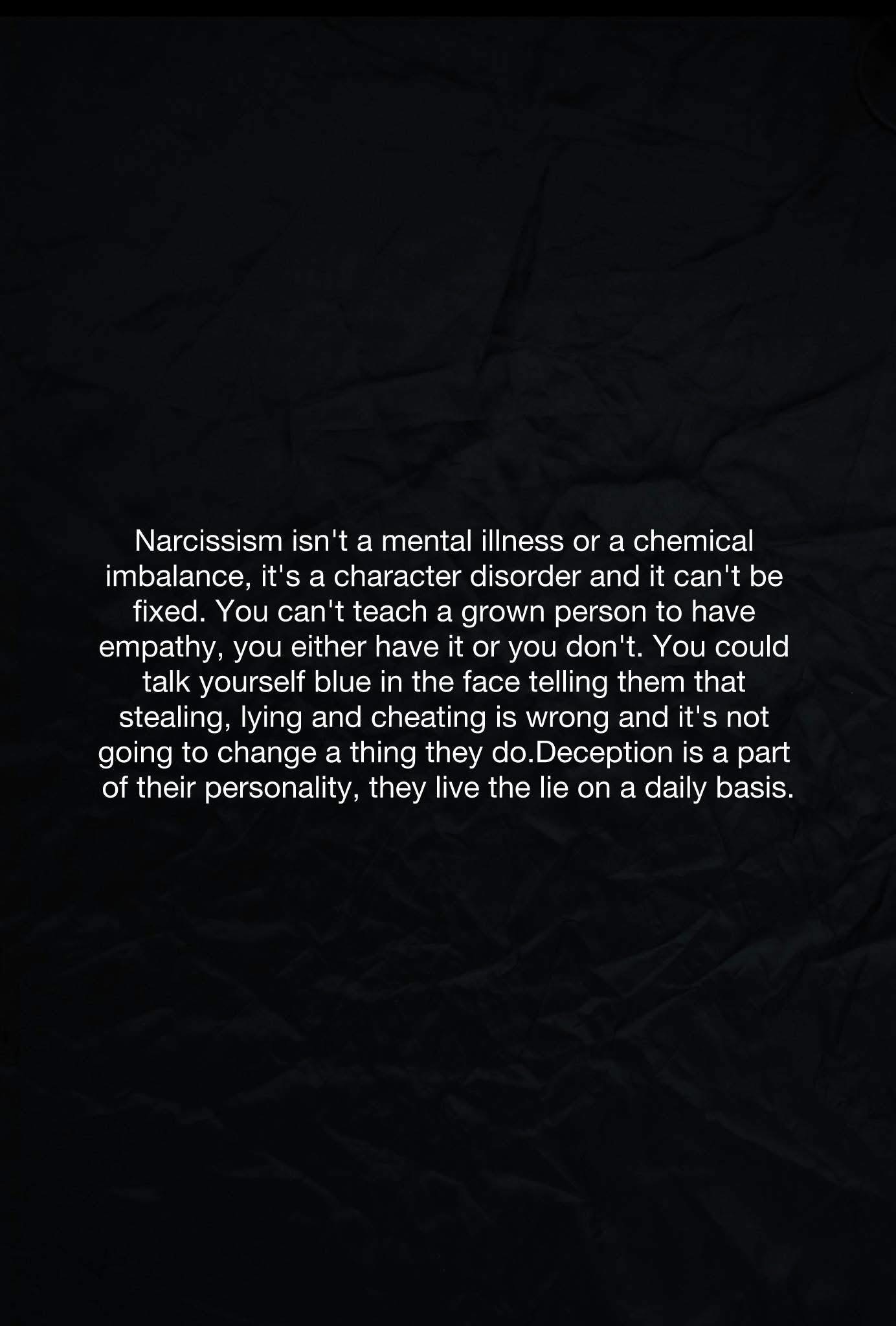 **Narcissism isn’t a mental illness or a chemical imbalance — it’s a character disorder, a deeply ingrained personality structure that shapes how someone sees themselves and the world.** It’s not caused by low serotonin, and it’s not something a prescription or a therapy session can “cure.” You can’t teach someone to have empathy if they fundamentally lack the capacity for it. It’s not a skill they forgot — it’s something they’ve rejected entirely because empathy gets in the way of control, manipulation, and self-worship.