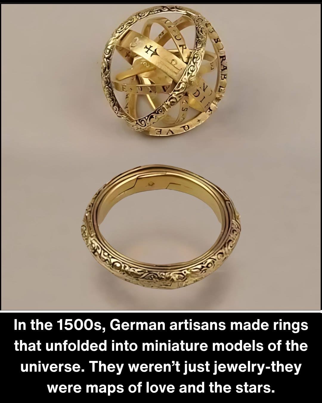 In the 1500s, German craftsmen created armillary sphere rings: tiny, interlocking bands that unfolded into delicate astronomical spheres. Each curve and hinge represented celestial circles — the equator, the ecliptic, the meridian — just like the massive metal globes once used by ancient astronomers.