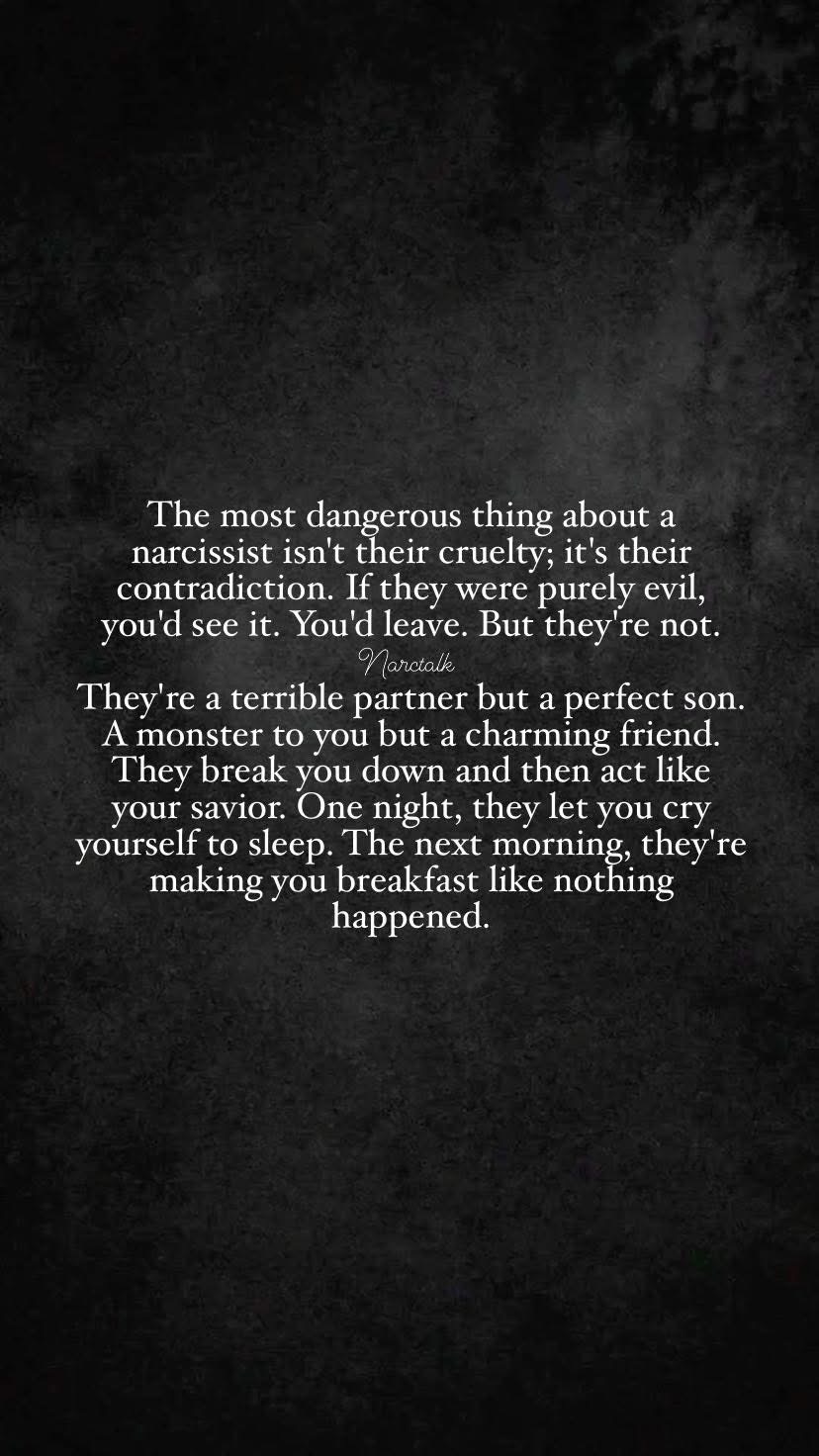 The most dangerous thing about a narcissist isn’t their cruelty; it’s their contradiction. If they were purely evil, you’d see it. You’d leave. But they’re not. They’re a terrible partner but a perfect son. A monster to you but a charming friend. They break you down and then act like your savior. One night, they let you cry yourself to sleep. The next morning, they’re making you breakfast like nothing happened.