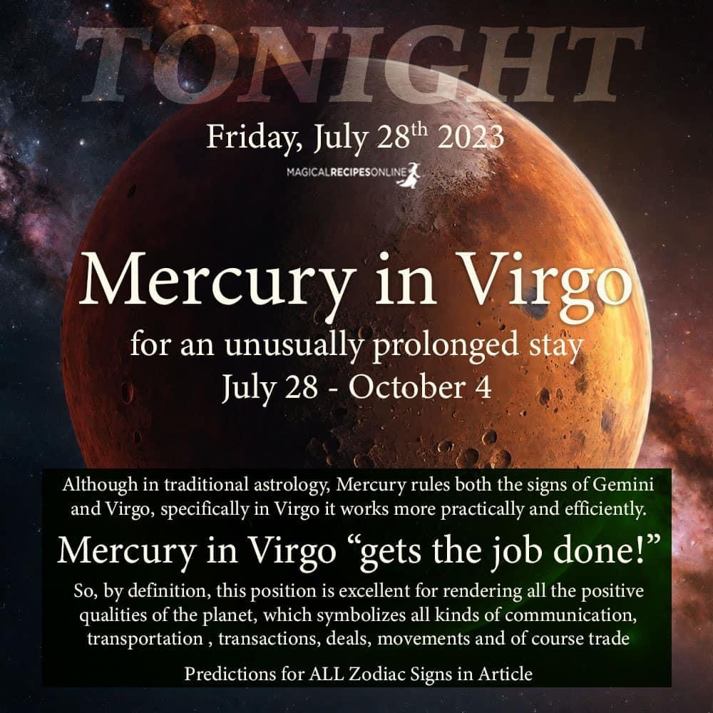 TONIGHT around midnight: Major Energy Shift – Mercury will enter Virgo ♍️ and stay there more more than two months ✨ https://www.magicalrecipesonline.com/2023/07/mercury-in-virgo-unusually-prolonged-stay-july-28-to-october-4-2023.html #magicalrecipesonline #astrology #mercury #mercuryinvirgo
