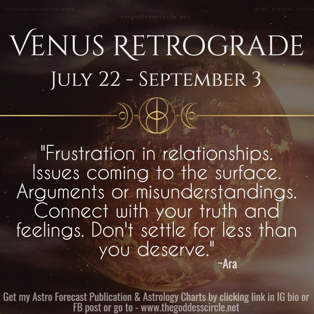 “Venus Retrograde in Leo brings focus to the issues in our relationships. Frustration can occur as our connections may be stagnant or not moving ahead as fast as we would like. Arguments are possible as are misunderstandings. Venus Retrograde in Leo can also have a tendency to be dramatic, so there may be situations that can be stressful and over the top. Emotions may run high and issues with others can be heightened. Stay connected to your truth as much as possible. Be clear when conveying needs or feelings and take a step back or some time for yourself if you need to recharge. The good side of this Retrograde is we can come face to face with some of the patterns in our relationships that need to be shifted once and for all. Honor your truth and don’t settle for less than you deserve. Get complete Retrograde Astrology guidance in my Astro Forecast Publication here: https://thegoddesscircle.podia.com/astro-forecast” ~Ara
