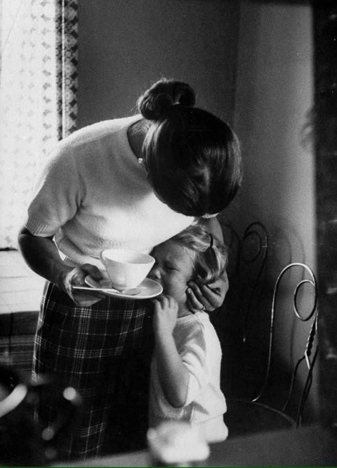 (Art: Photograph of Jennie Magill comforting her crying daughter by Grey Villet)