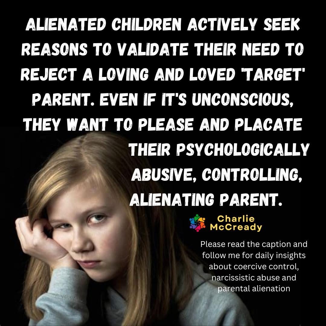 Alienated children often suffer from cognitive dissonance as they struggle to reconcile the negative narrative imposed on them by the alienating parent and their own genuine feelings and memories of the ‘target’ parent. This can lead them to seek reasons to justify their rejection of a loved, loving, available and non-abusive parent. It’s also a means to align with the alienating parent who presents as stronger and apparently safer. This is what the child wants – safety, security, love. Initially, they may subconsciously prioritise pleasing the controlling alienating parent to avoid conflict or further manipulation.