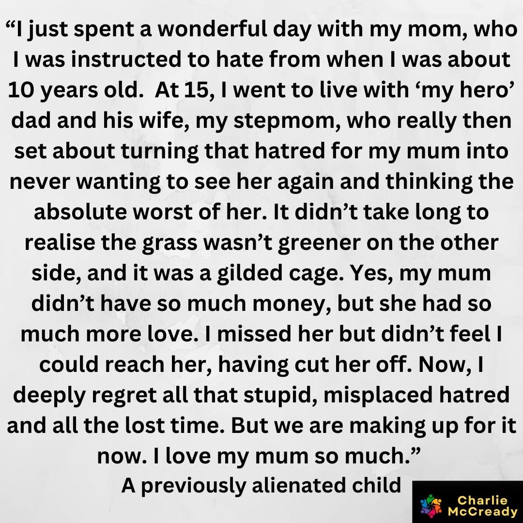 I look forward to the day when there’s a wider public understanding of what we call ‘parental alienation’ (child psychological abuse) and support, interventions, education, and a focus on encouraging the pathogenic parent to seek professional help.