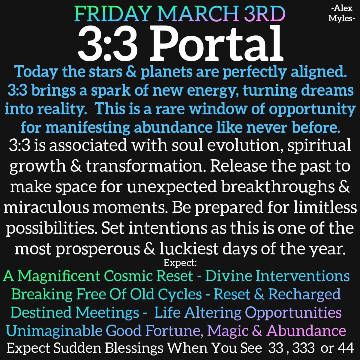 On March 3 (3:3) an energy portal opens, offering divine interventions, unexpected plot twists, positive energy, good fortune, and opportunities for major growth and transformation. This is a rare and powerful opportunity to shape your destiny by setting clear intentions and taking intentional action to manifest your goals and dreams.