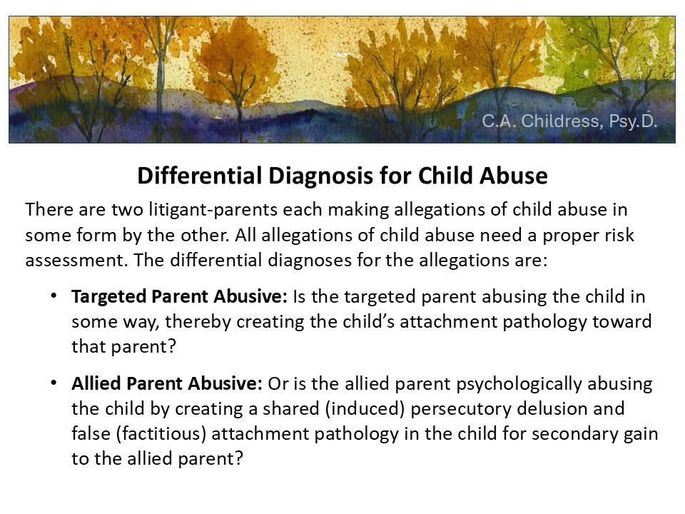 It might be authentic child abuse by the targeted parent creating the child’s attachment pathology toward that parent – OR – it might be child psychological abuse by the allied parent who is creating a persecutory thought disorder and false (factitious) attachment pathology in the child for secondary gain to the parent.