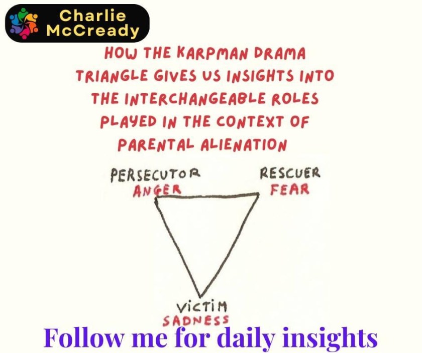 The drama triangle is interesting in terms of identifying unhealthy family dynamics. People can switch roles and perpetuate the drama. Until they take responsibility for the part they’ve played. Unfortunately, alienating parents will refuse accountability or work towards co-parenting. But ‘target’ parents can empower themselves and refuse to be victimised – the pathology is the problem, not them. They can initiate self-care and be their own saviour. Children, as rescuers, can reclaim their autonomy and authenticity and see the difference between helping and enabling. Rescuers can empower rather than enable.